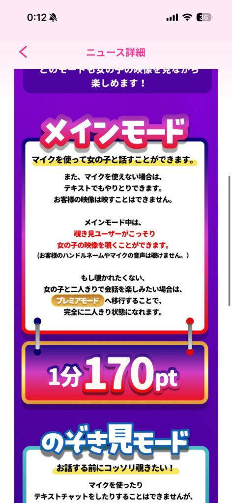 - 覗きモード(170pt/分):他の人がメインモードで配信している女性を、こっそり覗ける。女性にはあなたの存在が見えない。下見に最適。